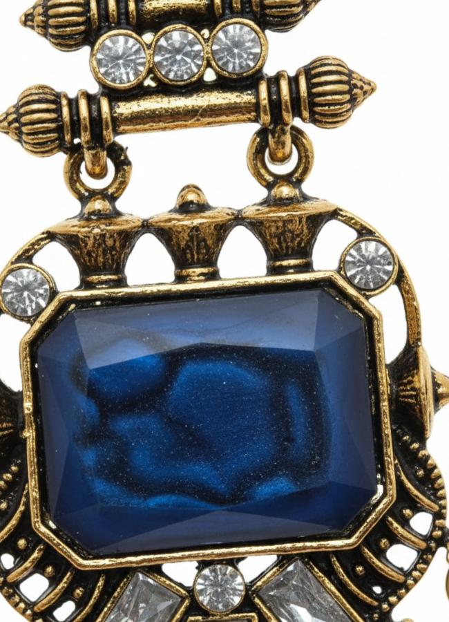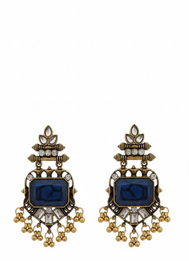 Stylish antique gold finish kundan dangler earrings featuring a rich blue stone and intricate detailing. Crafted in premium artificial metal with anti-tarnish protection, perfect for festive and traditional wear.