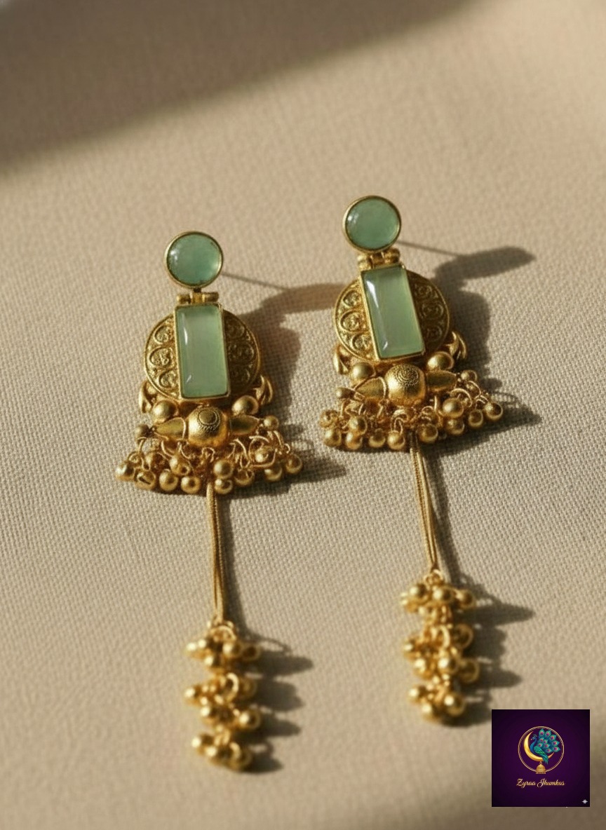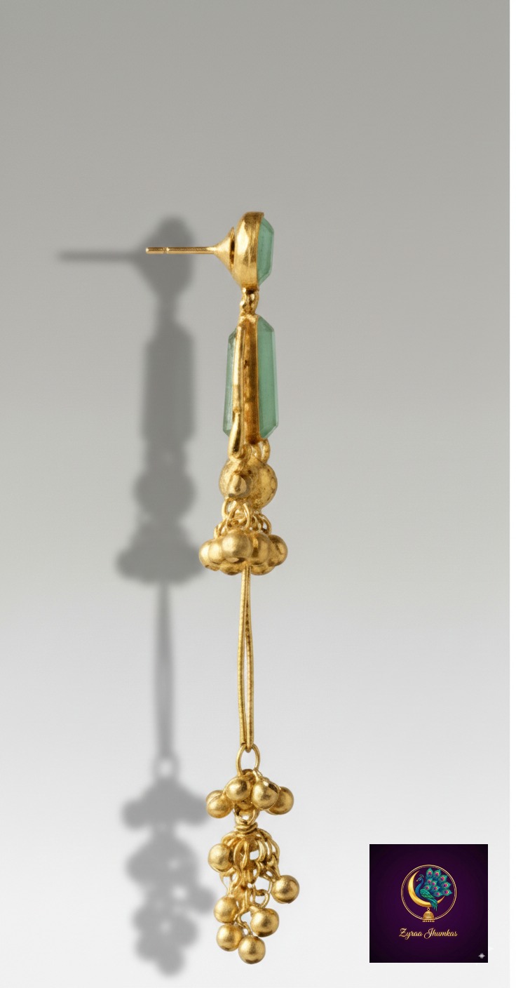 These Traditional Kashmiri Jhumkas are designed with a rich gold-plated finish and adorned with elegant pastel green stones.