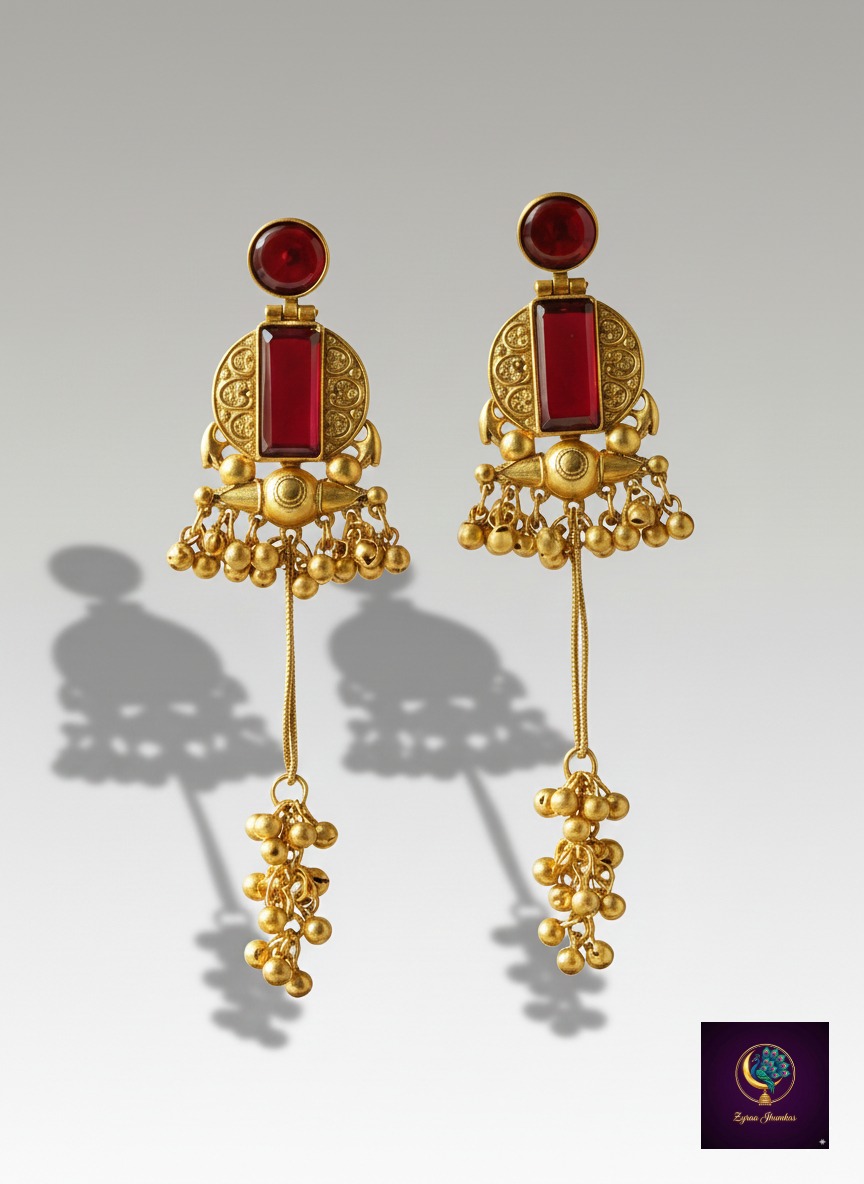 Beautiful gold-plated Kashmiri long dangle earrings featuring a bold red stone and bead clusters. Anti-tarnish, non-fading, and lightweight—perfect for weddings, festive wear, and ethnic styling.